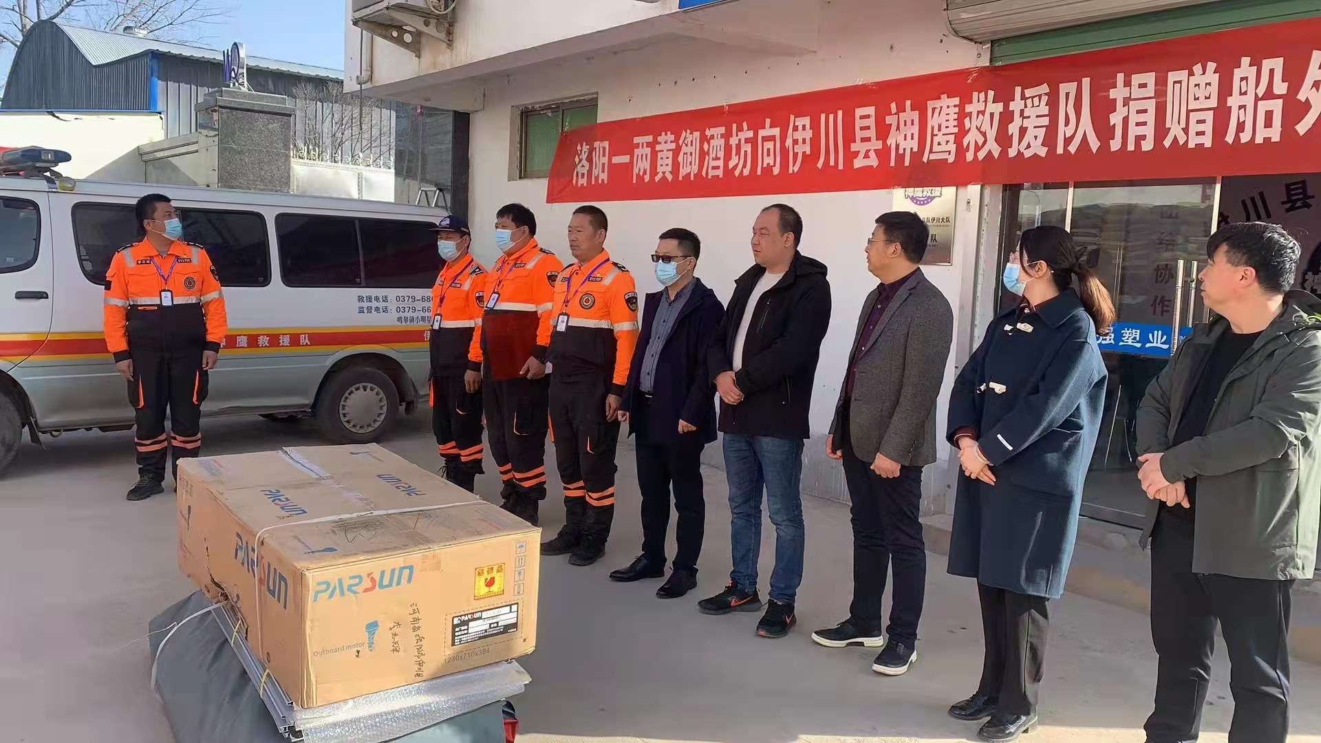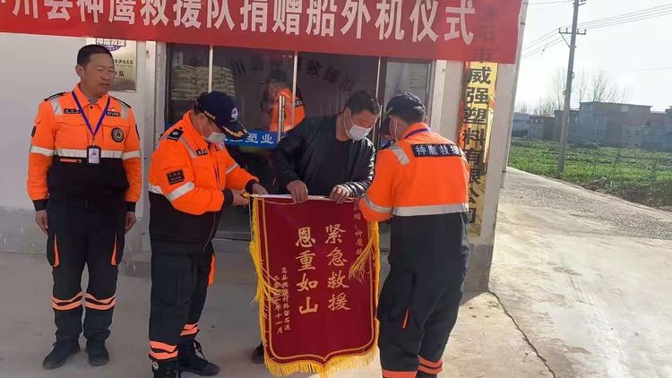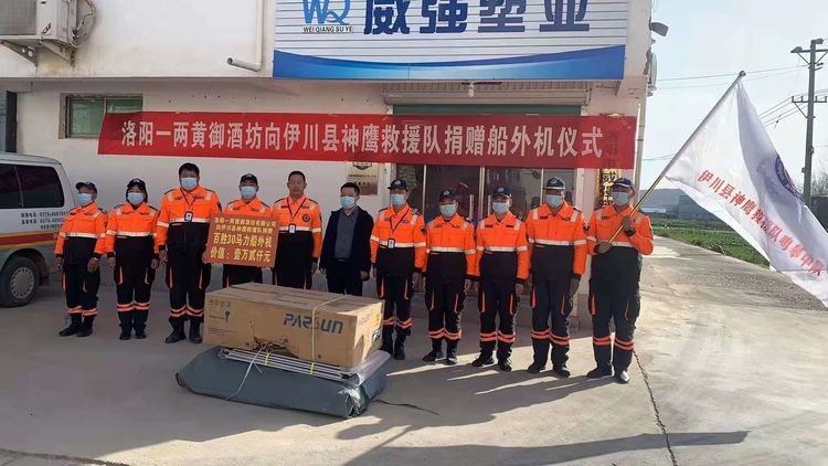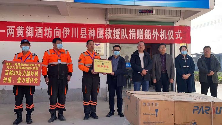 2021年11月12日,伊川縣神鷹救援隊(duì)出動(dòng)隊(duì)員13人次出勤車(chē)輛5輛次,隆重舉行捐贈(zèng)船外機(jī)儀式,感謝愛(ài)心企業(yè)洛陽(yáng)一兩黃御酒坊向伊川神鷹救援隊(duì)捐贈(zèng)價(jià)值壹萬(wàn)貳仟元百勝30馬力船外機(jī)一臺(tái)并給愛(ài)心企業(yè)家贈(zèng)送愛(ài)心企業(yè)牌匾。同時(shí)走失兒童家屬送來(lái)錦旗表示感謝!感謝伊川縣神鷹救援隊(duì)在他們危難時(shí)刻及時(shí)幫助尋找到孩子。